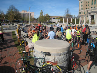 This Saturday was host to the 4th Annual Pumpkin Pedaller. Big thanks to Asheville on Bikes for putting together this gigantic rolling costume party! The party started in front of the Court house and the headcount was somewhere in the neighborhood of 132 people. We snaked around the city, much to the amusement/frustration of the residents. Unlike a critical mass (read critical mess) this form of bicycle advocacy stresses that riders wear helmets, obey all traffic laws, and basically frowns upon acting like a dumbass and purposely trying to piss off drivers. I stopped participating in critical mass rides when attending Virginia Tech due to hordes of riders pretty much making cyclists look like a bunch of hooligans that liked to disregard traffic laws and snarl up traffic by blocking lanes. Great idea, piss off the car drivers, they'll definitely respect us on the weekday commute. This ride was filled with costumes, badass bikes of all shapes and sizes, good friends from out of town, awesome phone calls about found stolen bikes, and so on. Once again thanks to Mike and Rachel and all the AOB volunteers! PS. I got my first tamale from the burrito cart guy. Super good stuff, you should support him.