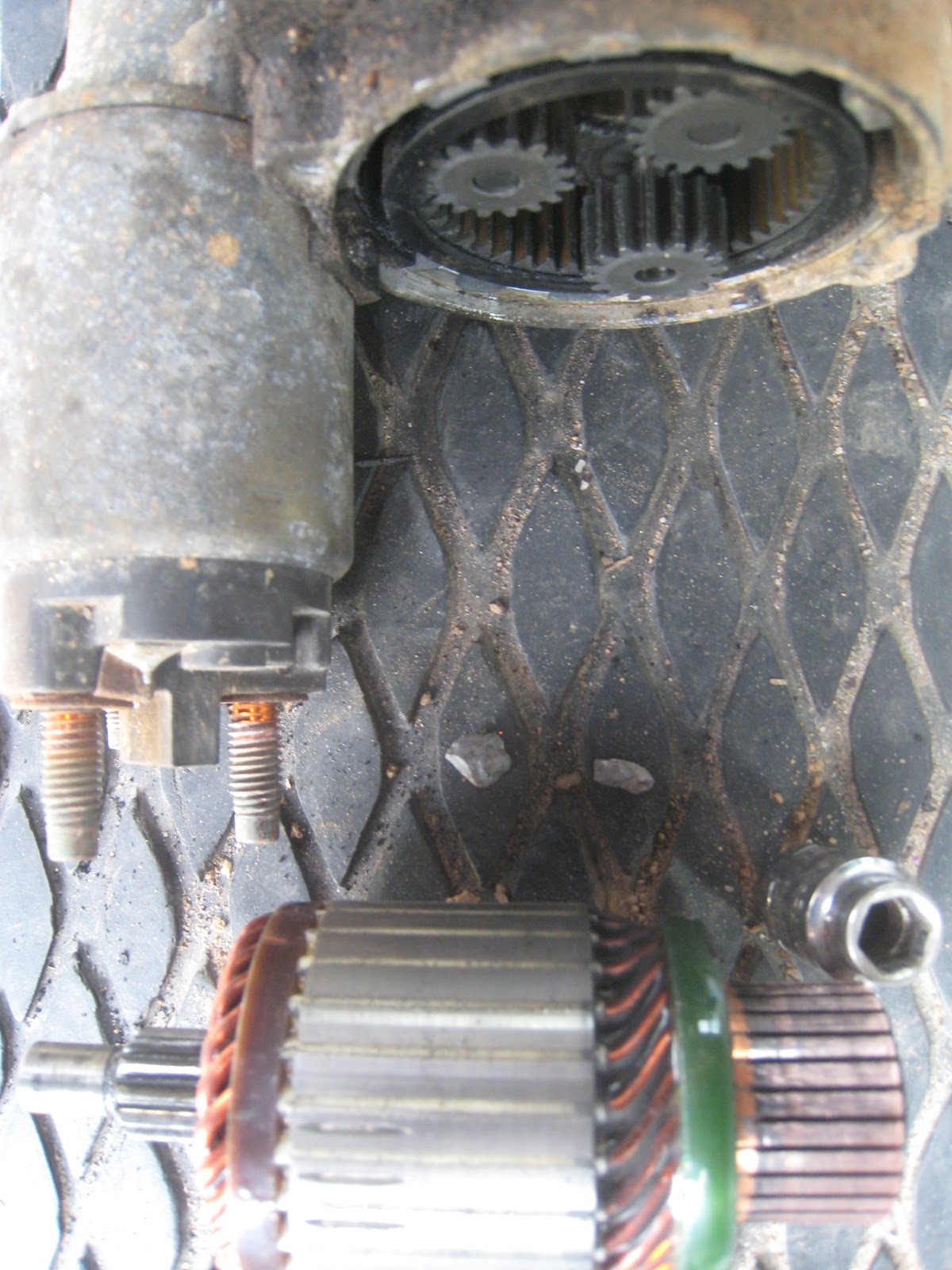After checking every fuse and relay, I decided that the only thing left to check would be the starter solenoid and the starter itself. Using the awesomely safe test of bridging a screwdriver across the terminals with the van in neutral, I was only able to get the starter to bump about 3 out of 5 times. The solenoid on the other hand fired every time. Ok, we're making progress. Pulling the starter I noticed that there was a lot of corrosion on the terminals. I decided to disassemble the can to also get a good look at the armature and the brushes of the motor as well. Lo and behold, taking apart the can revealed the problem. Apparently a hole in the starter had allowed gravel to slip into the can and bind up the gears. The starter pinion was not able to move into place against the flywheel because of the gravel. The hilarity of the situation, was that 15 minutes prior I had just read in the instructions for trouble shooting the starter, that shorting the terminals of the starter motor should cause it to whir smoothly and that it should not sound gravely. Go figure !